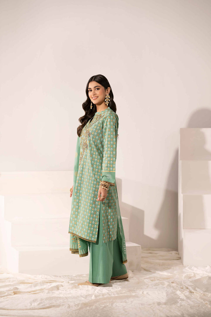 Enhance the value of the entire clothing with this printed embroidered three-piece suit from the latest pret summer WHITE & GOLD PASTE collection.
