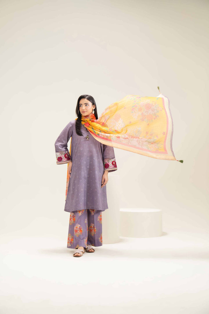 Enhance the value of the entire clothing with this printed embroidered three-piece suit from the latest pret summer collection.