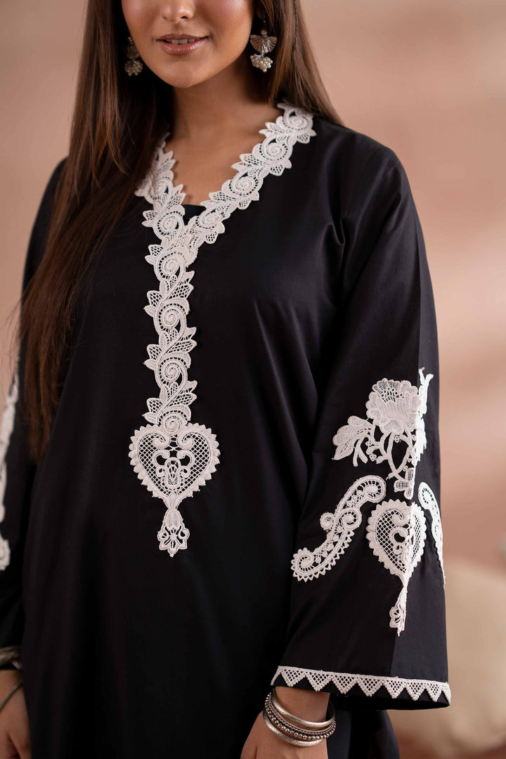 Straight long shirt with a V-neckline, enhanced with lace patch detailing.